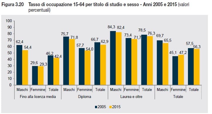 This chart from the Istat, the Italian national institute of statistics, displays the labor market participation of the population aged 15–64 in Italy, by sex and level of education. There is absolutely nothing extraordinary about it. On the contrary, it is hard to find anything more typical of how statistical agencies represent data visually. Bar charts are generally safe bets for the correct and effective visuals, as they don't force us to think too much about how we are going to communicate.